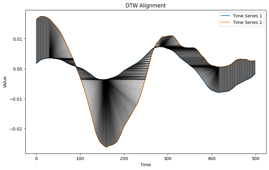 depict_DTW(Xopera0[11].T, Xopera1[30].T, dist=euclidean, radius=10)