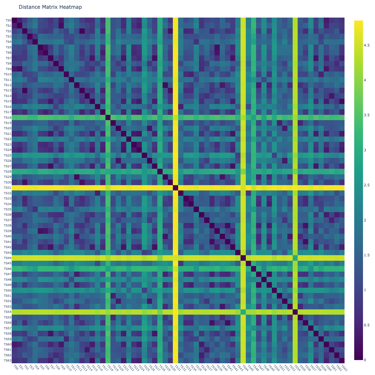 Xopera = np.concatenate([Xopera0, Xopera1])plot_dm_heatmap(Xopera, alignment_type='fastdtw', gamma=1, normalize='log', n_jobs=8) # 'dcor', 'fastdtw'(euclidean), 'tslearn_dtw'(euclidean), 'soft_dtw'(sqeuclidean), 'soft_dtw_div'